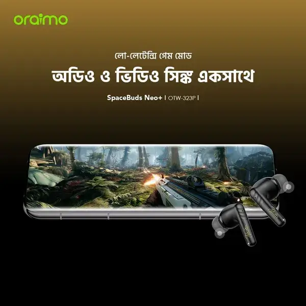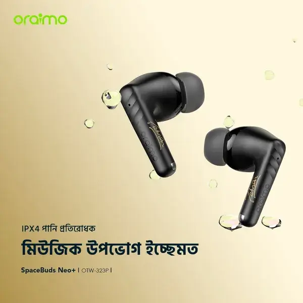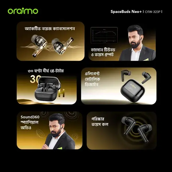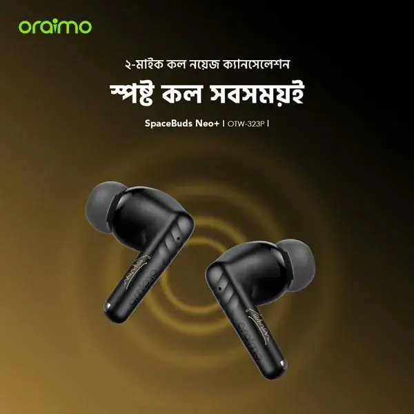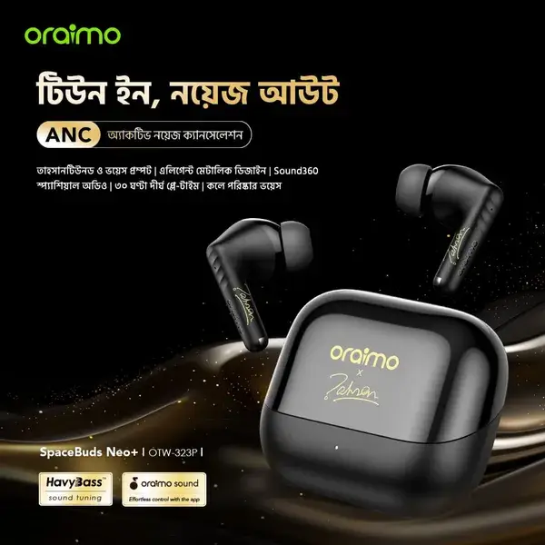 Discover an audio experience crafted for perfection. The Oraimo SpaceBuds Neo+ combines premium aesthetics with high-performance sound, co-tuned by Bangladeshi music icon Tahsan to deliver powerful bass and crisp, clear highs. From the studio to your ears, this is sound as it was meant to be heard.